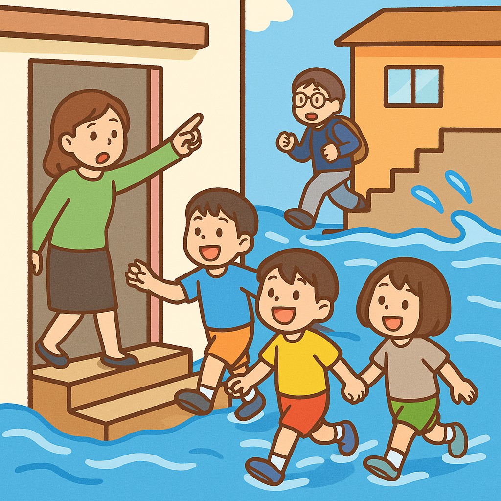 「洪水が起きたらどうするか」という想定を体験することで、状況を理解し行動を切り替える力を育てます。 -