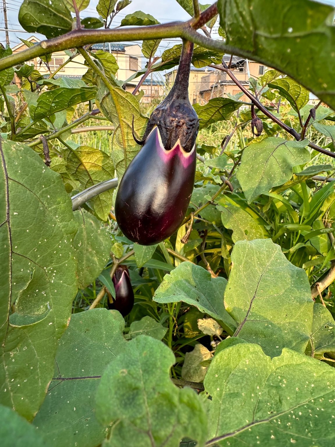 畑では、つやつやのナスが立